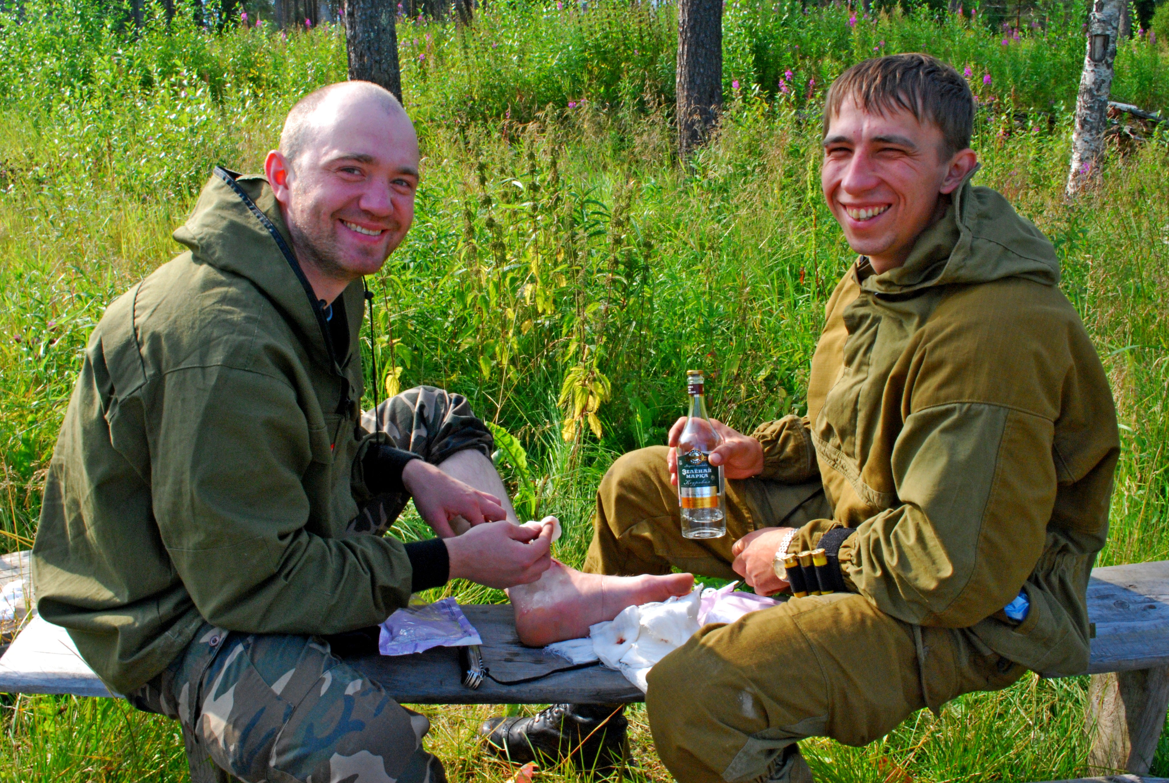 Ночевали на выезде из Долины на одной из рыбацких стоянок. Шел дождь и летали комары. Мишка-травматолог занимался самообслуживанием: сначала себя травмировал топором в процессе рубки дров, потом сам же себя зашивал и забинтовывал. В общем-то, это было, пожалуй, единственное целевое использование его «аптечки» — так называлась огромная сумка-баул с медикаментами и орудиями пыток.
