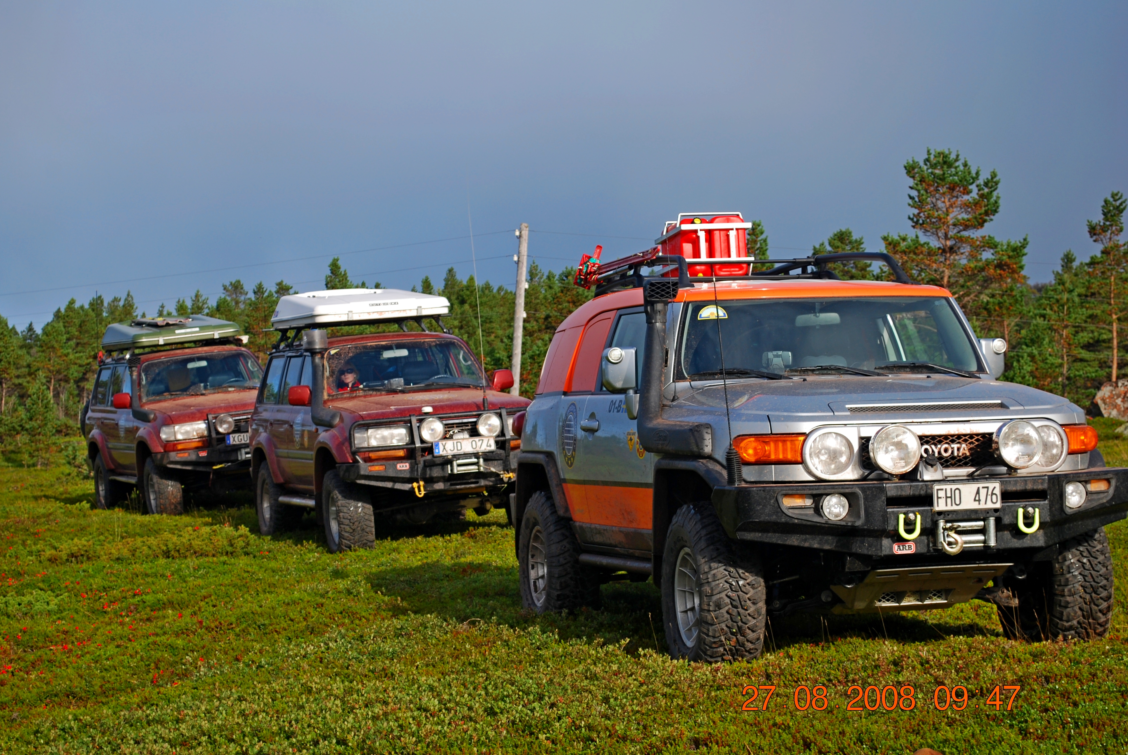 Все, диалог пошел. Шведы, едут обкатывать машину Toyota FJ Cruiser по суровой российской действительности (это она такая красивая и навороченная первая шла!). в сопровождении ей – пара проверенных временем «восьмидесяток». Бампера, шноркели, наклейки, все так красиво, аж тошно! Ехали они по нашему маршруту, но в другую сторону, т.е. с юга на север. Тыкали в карту, интересовались дорогой. Интересно, что на их мелкой и неинформативной карте тот самый секретный аэродром был обозначен. На наших детальных генштабовских – нет. Все хорошо, говорим, мол, there are no problems for your cars 😀