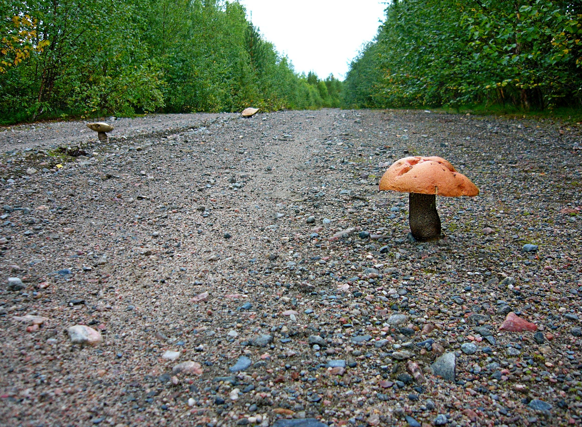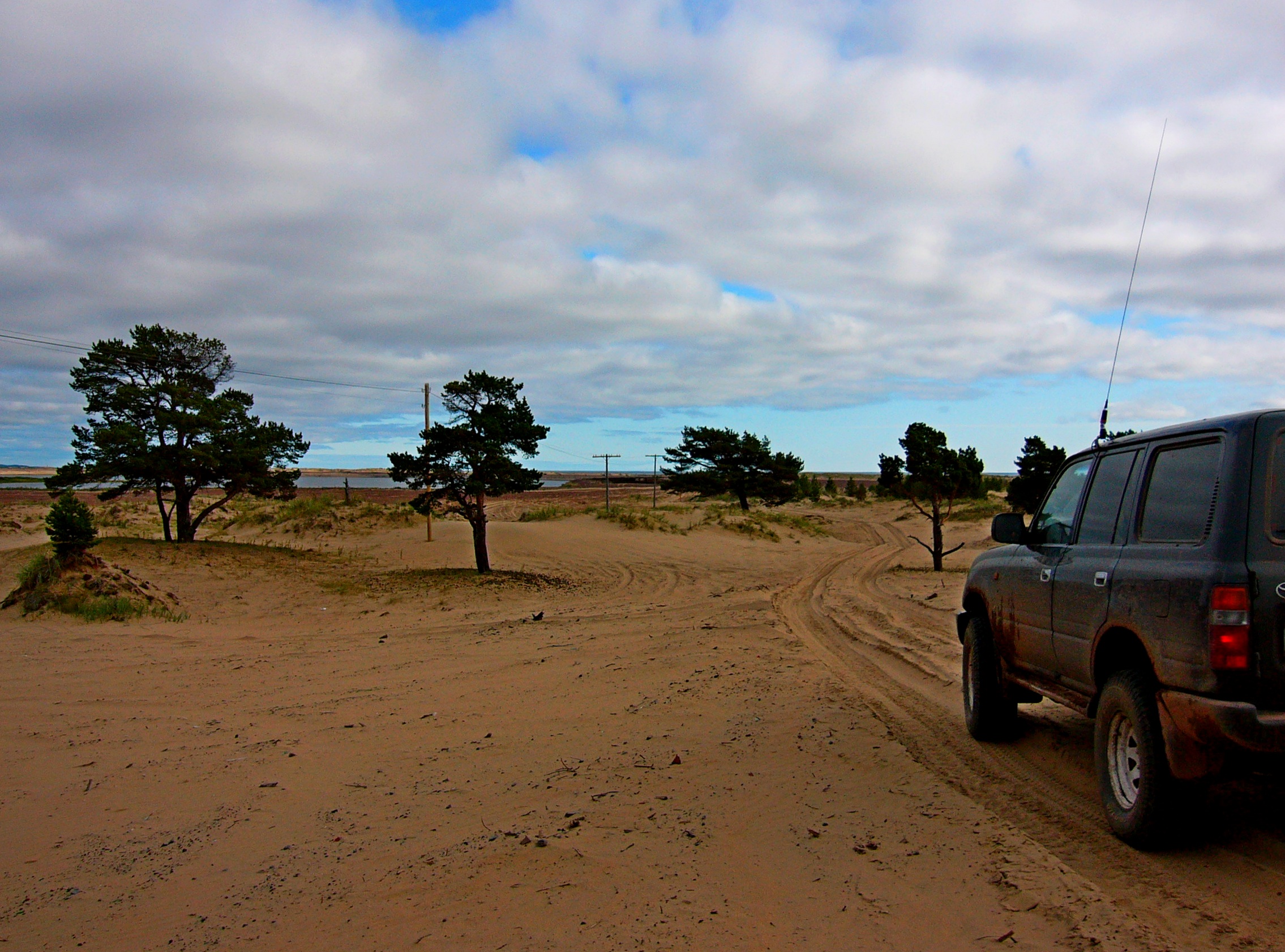 После брошенного села Восточное Мунозеро пошла относительно нормальная грунтовка. Впереди – Умба и встреча с Игнатом, который уже должен был добраться до Терского берега. Километров за 30 мы начали слышать его позывные, а он стал слышать нас. Как потом сказал Глеб, он понял, что это мы, когда услышал в эфире «У нас зеленая остановка!» — «А у нас – грибная!». Грибы в тех местах растут прямо на дороге, поэтому машины периодически останавливались, из них выпрыгивал «десантник» и срезал гриб. Грибы мы брали только белые, подосиновики и подберезовики (все остальные там вообще растут целыми полянами, хоть косой коси!). Вот так, не выходя из машины мы неоднократно собирали грибы себе на ужин. Добавить картошечки — и ужин на шесть человек готов!