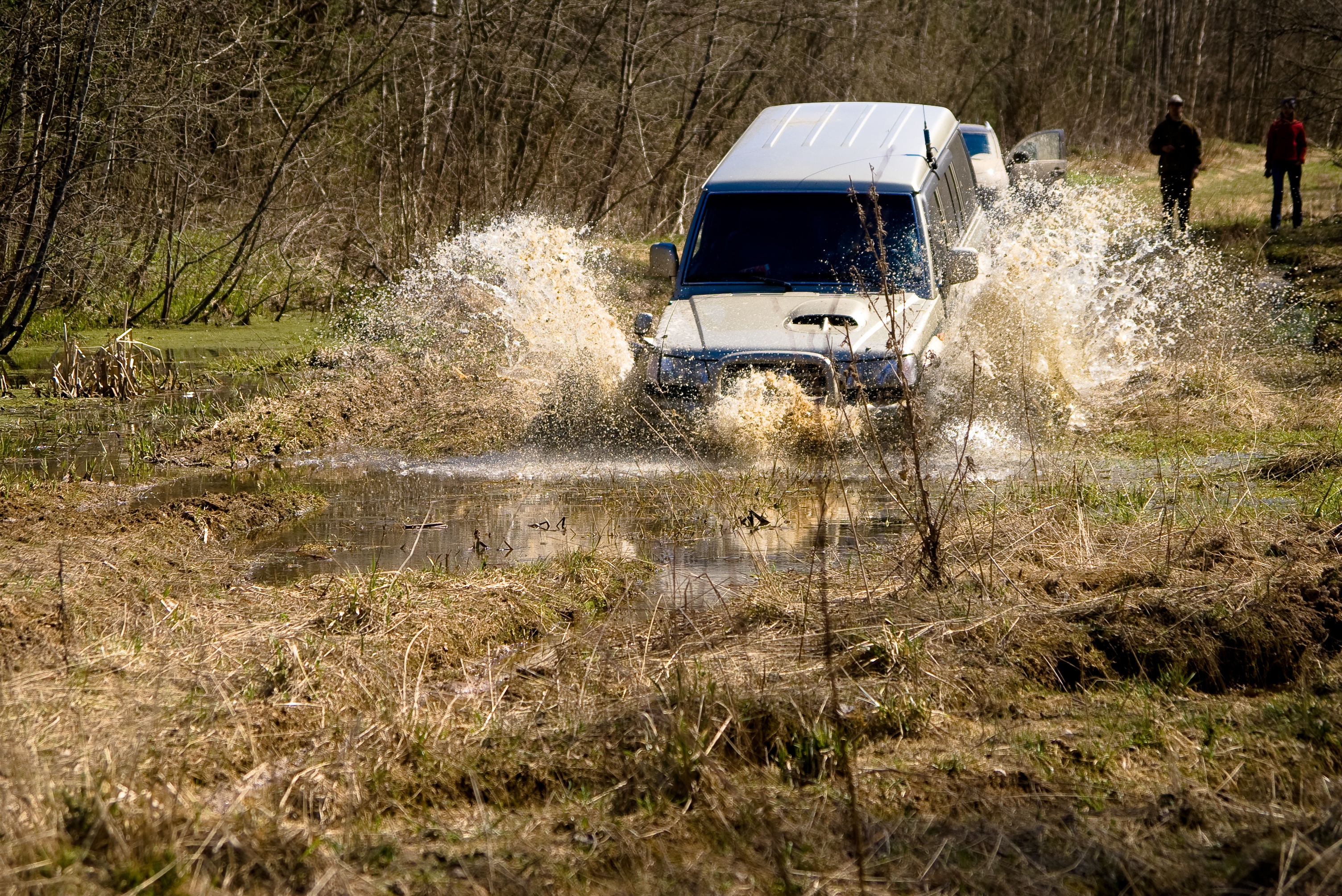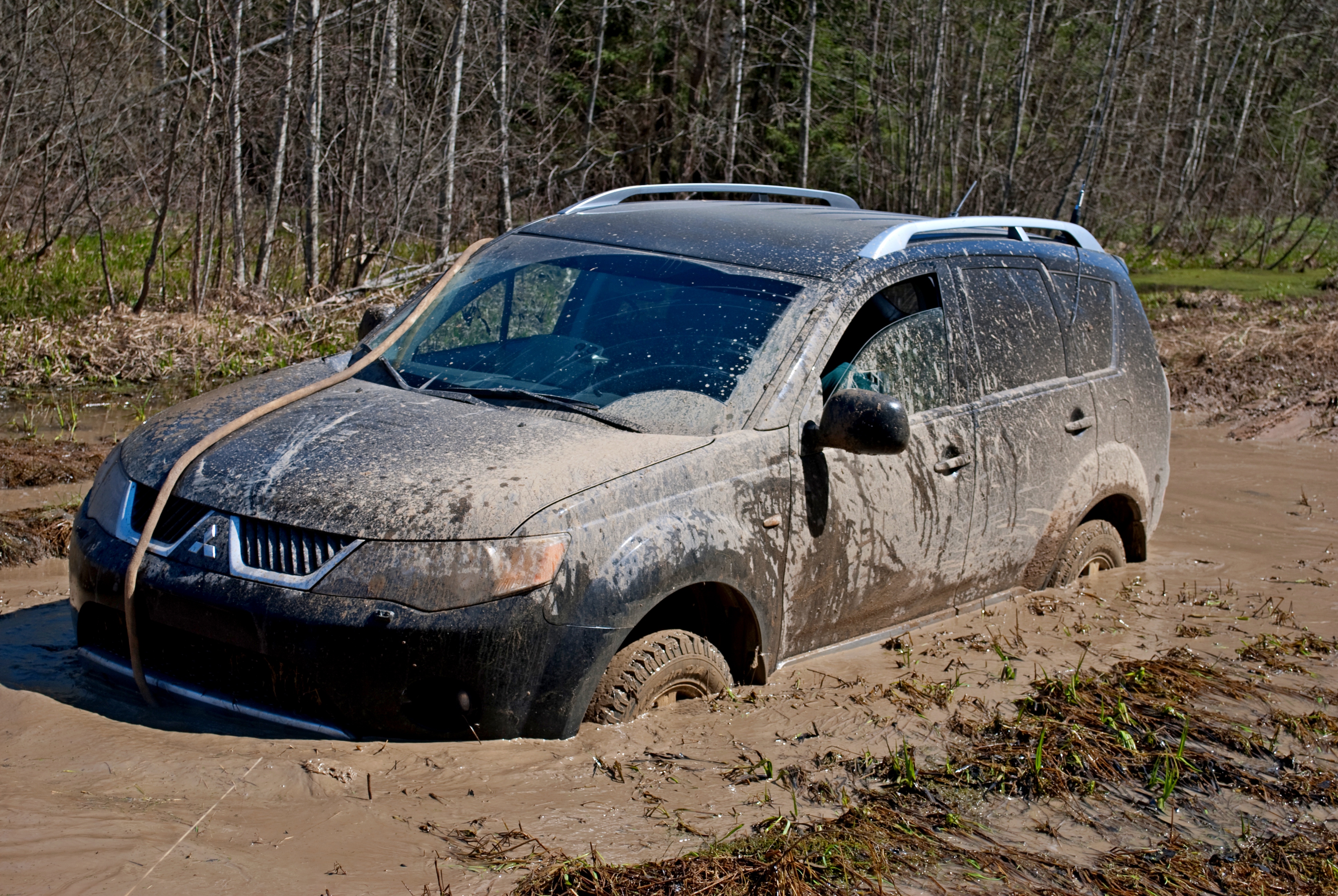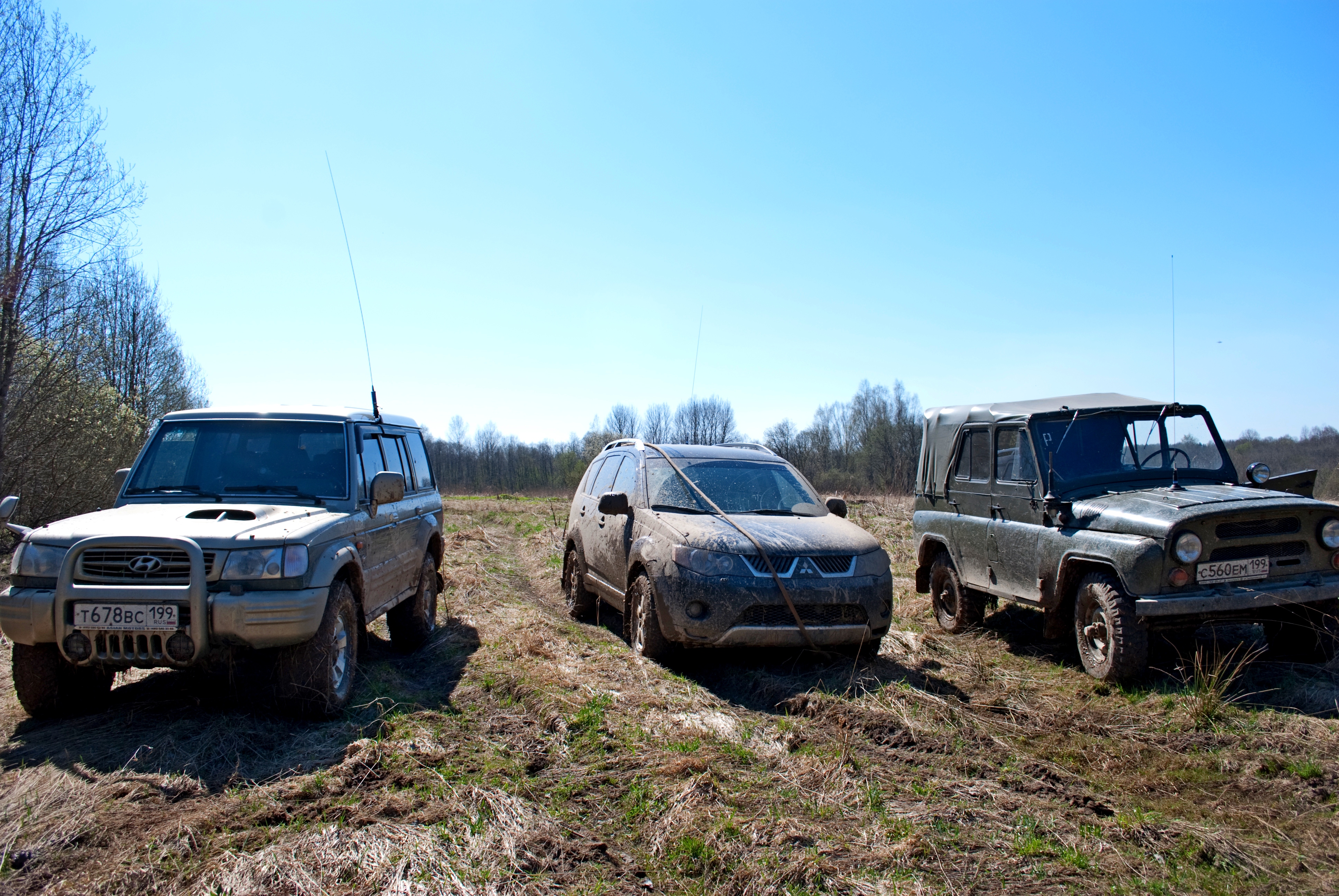 Начинаем движение на запад. Поскольку с нами был маленький и дорогой полноприводный автомобильчик, приходилось с этим считаться. Когда я говорю «считаться» я имею ввиду, что последующие несколько часов мы тащили Аутлендер на тросе. Традиционное преодоление препятствий – я проезжаю, после меня с разбегу пытается взять преграду Аутлендер. Иногда получалось. Иногда – нет. Тогда я сдаю назад и мы цепляем трос (после второй лужи один трос я не отцеплял от своего хвоста, наматывал на запаску, а Аутлендер – от своего переднего крюка). Один раз я тоже ошибся с траекторией и сел на пузо. За мной с разбегу не поглядев сел Аутлендер – хорошо, что у него клиренс меньше – до меня не доехал. УАЗка совершенно читерски объехал эту проблему и вытащил меня, ну а я – Аутлендер. Вообще, это была, кажется, единственная преграда, которую можно было объехать…
