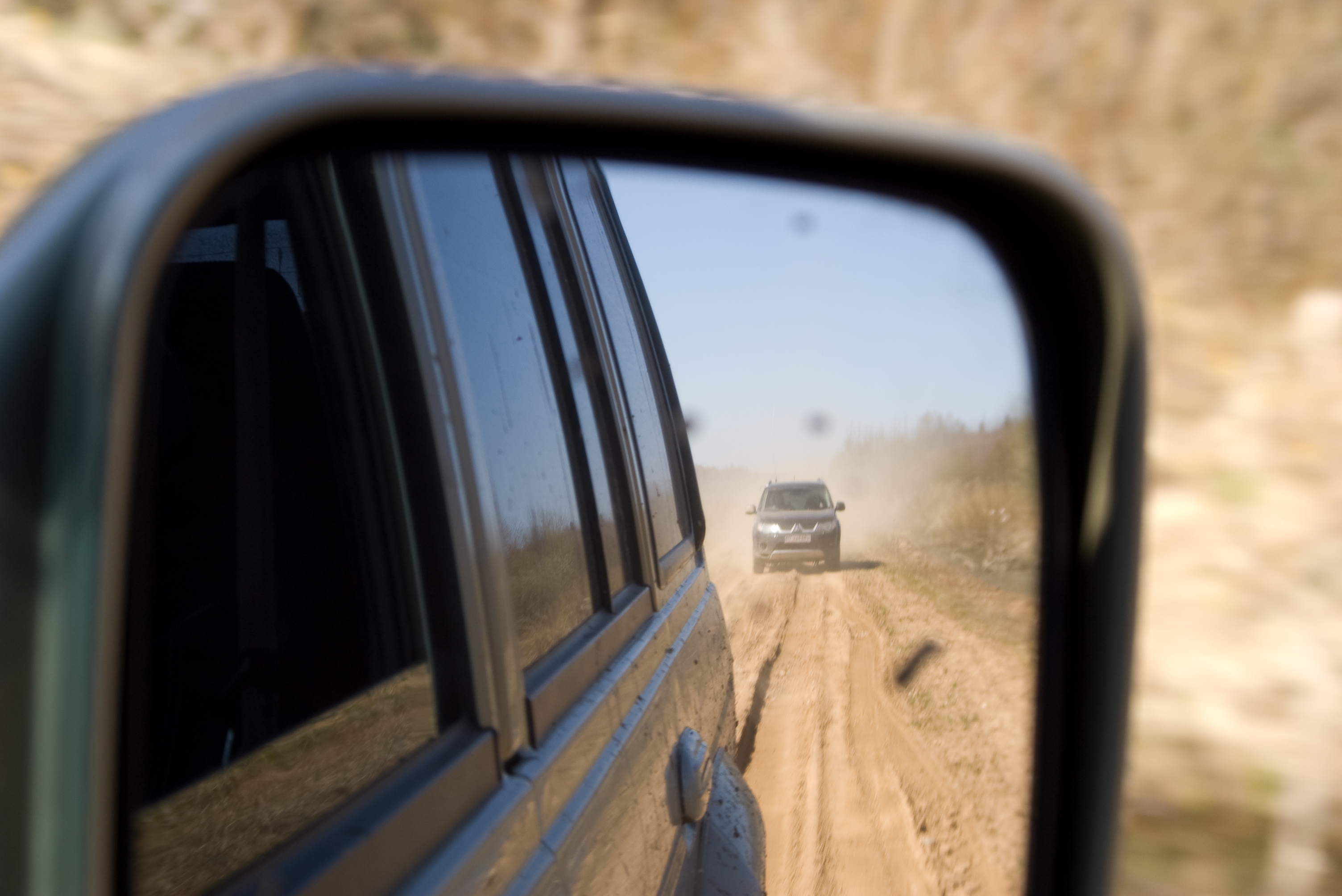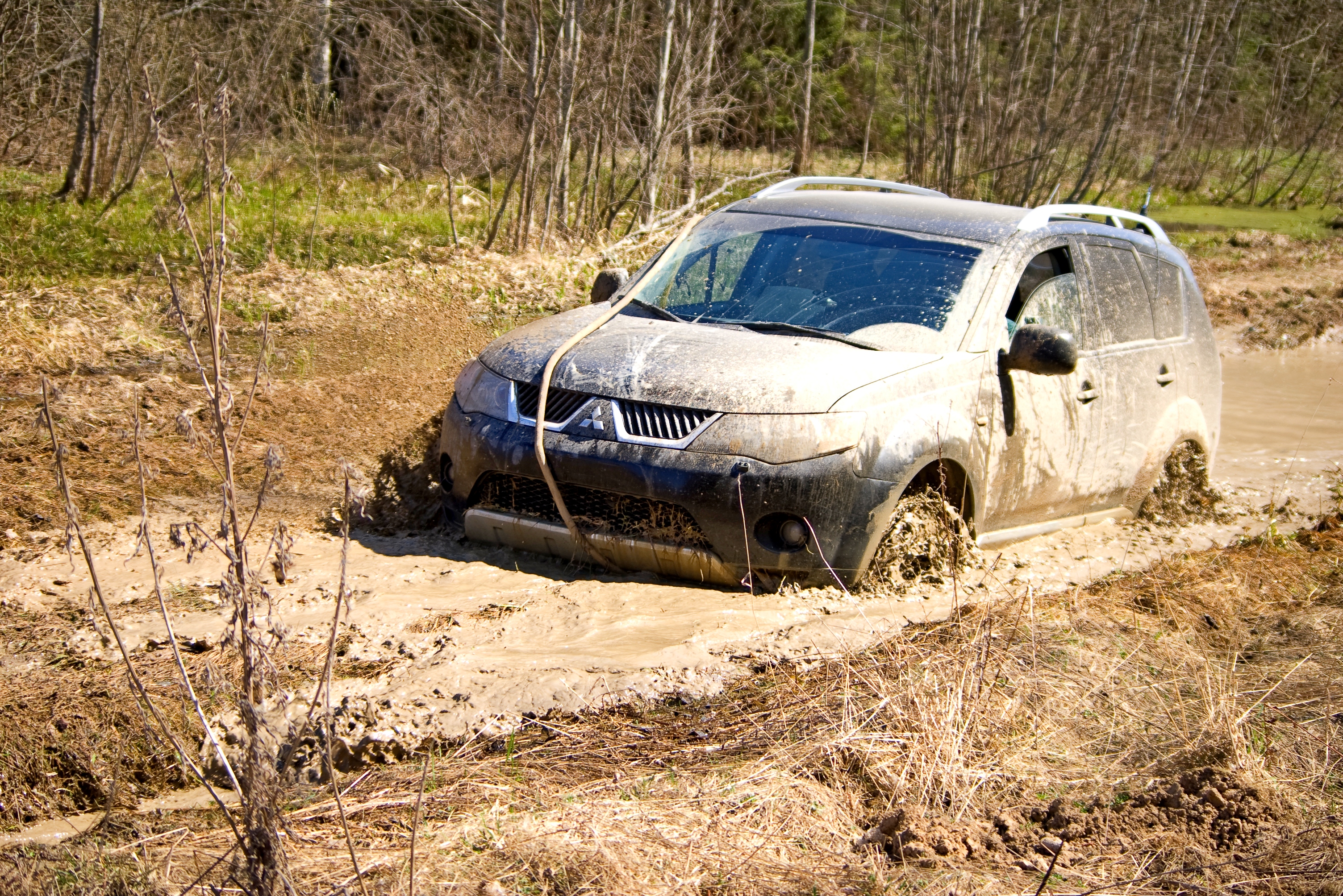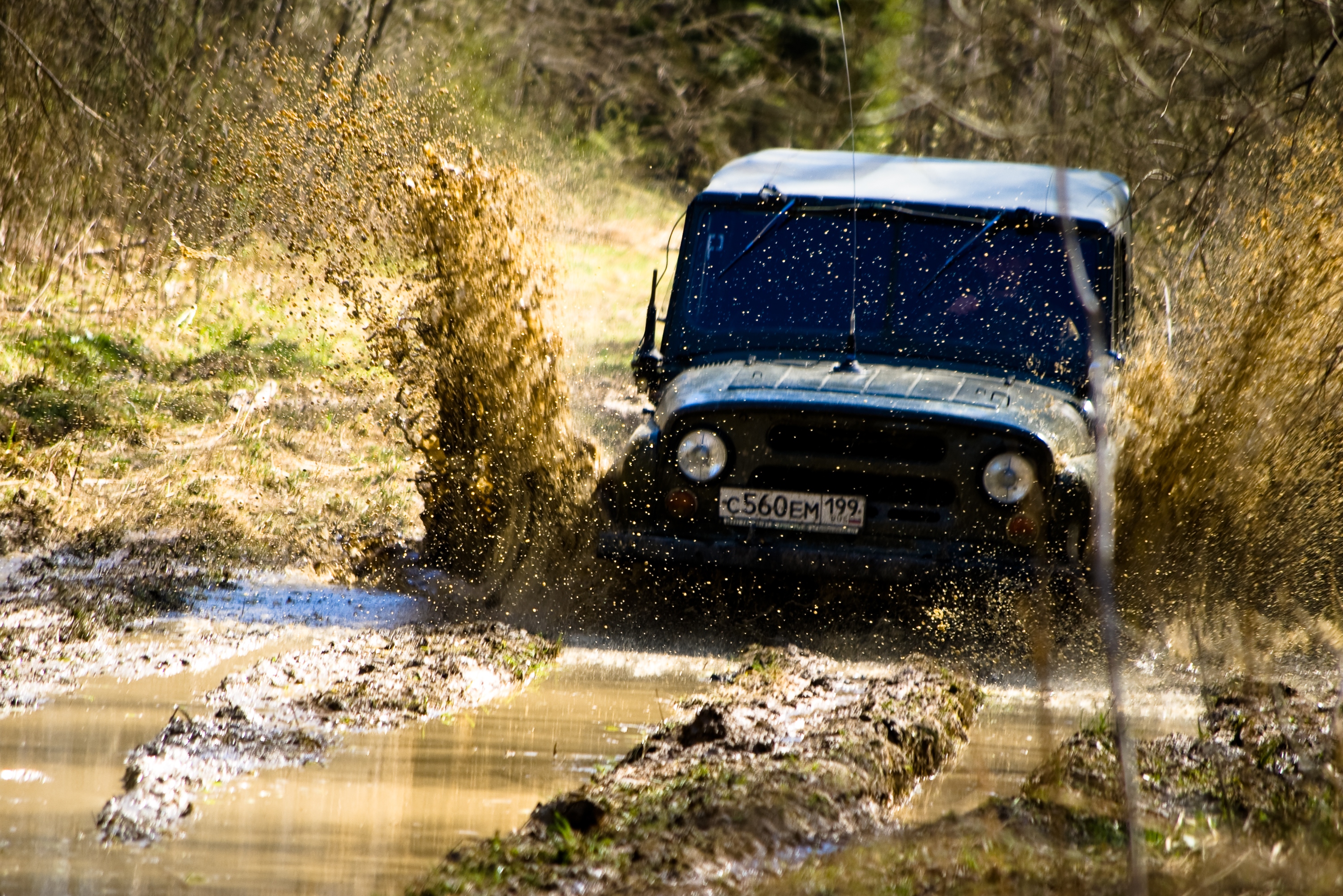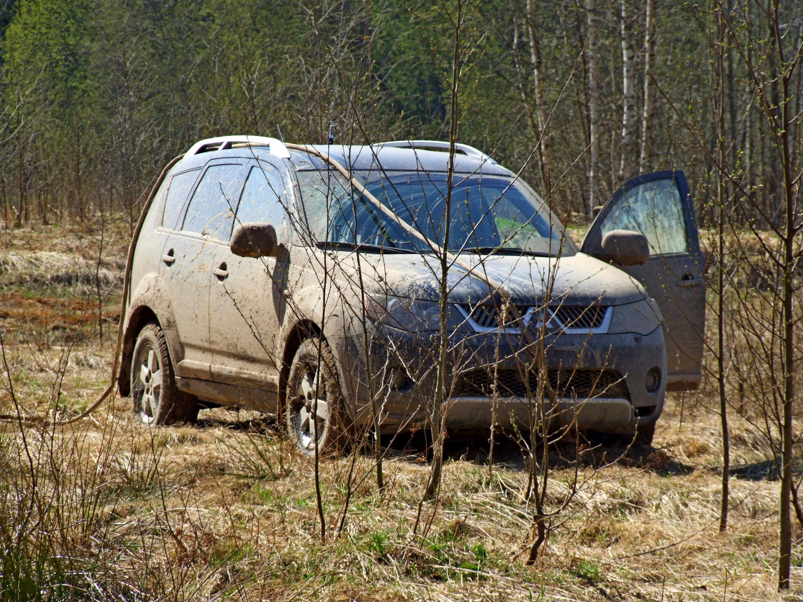 Начинаем движение на запад. Поскольку с нами был маленький и дорогой полноприводный автомобильчик, приходилось с этим считаться. Когда я говорю «считаться» я имею ввиду, что последующие несколько часов мы тащили Аутлендер на тросе. Традиционное преодоление препятствий – я проезжаю, после меня с разбегу пытается взять преграду Аутлендер. Иногда получалось. Иногда – нет. Тогда я сдаю назад и мы цепляем трос (после второй лужи один трос я не отцеплял от своего хвоста, наматывал на запаску, а Аутлендер – от своего переднего крюка). Один раз я тоже ошибся с траекторией и сел на пузо. За мной с разбегу не поглядев сел Аутлендер – хорошо, что у него клиренс меньше – до меня не доехал. УАЗка совершенно читерски объехал эту проблему и вытащил меня, ну а я – Аутлендер. Вообще, это была, кажется, единственная преграда, которую можно было объехать…