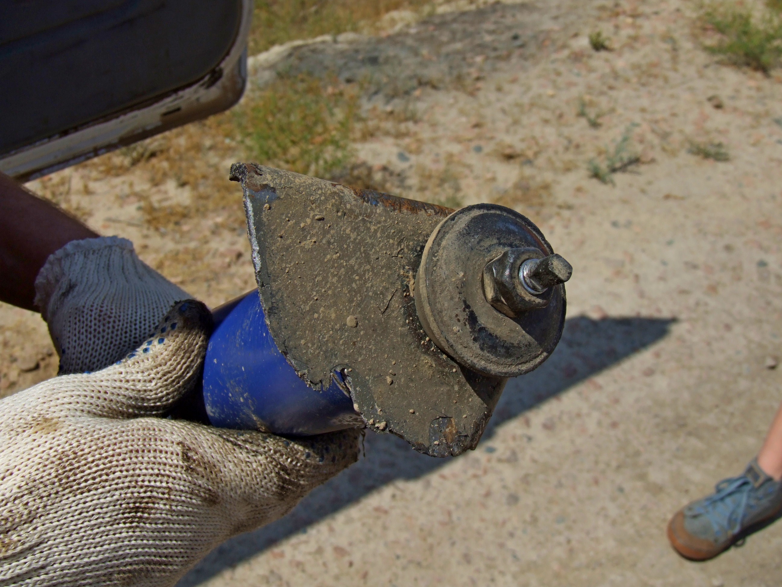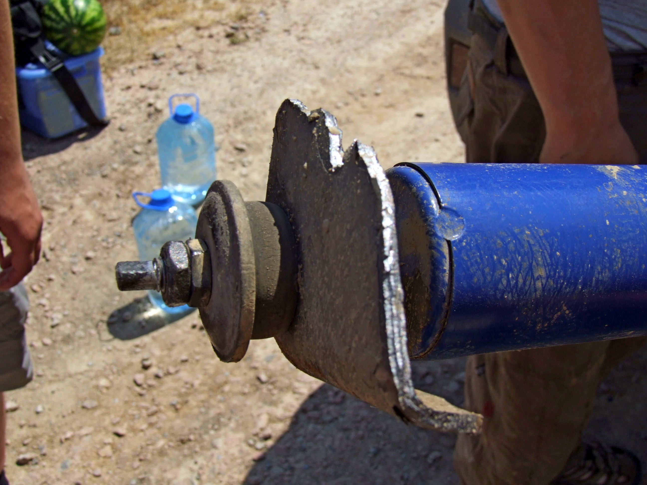 Продолжаем движение на юг. На сегодня наша цель – Узбекская граница под Чимкентом. Едем в сторону Кызыл-Орды. Останавливаемся, чтобы посмотреть, что это бумкает справа спереди у Серого. Обнаруживается оторванное крепление амортизатора. Амортизатор аккуратно демонтируется и мы продолжаем движение, параллельно пытаясь найти сварку.