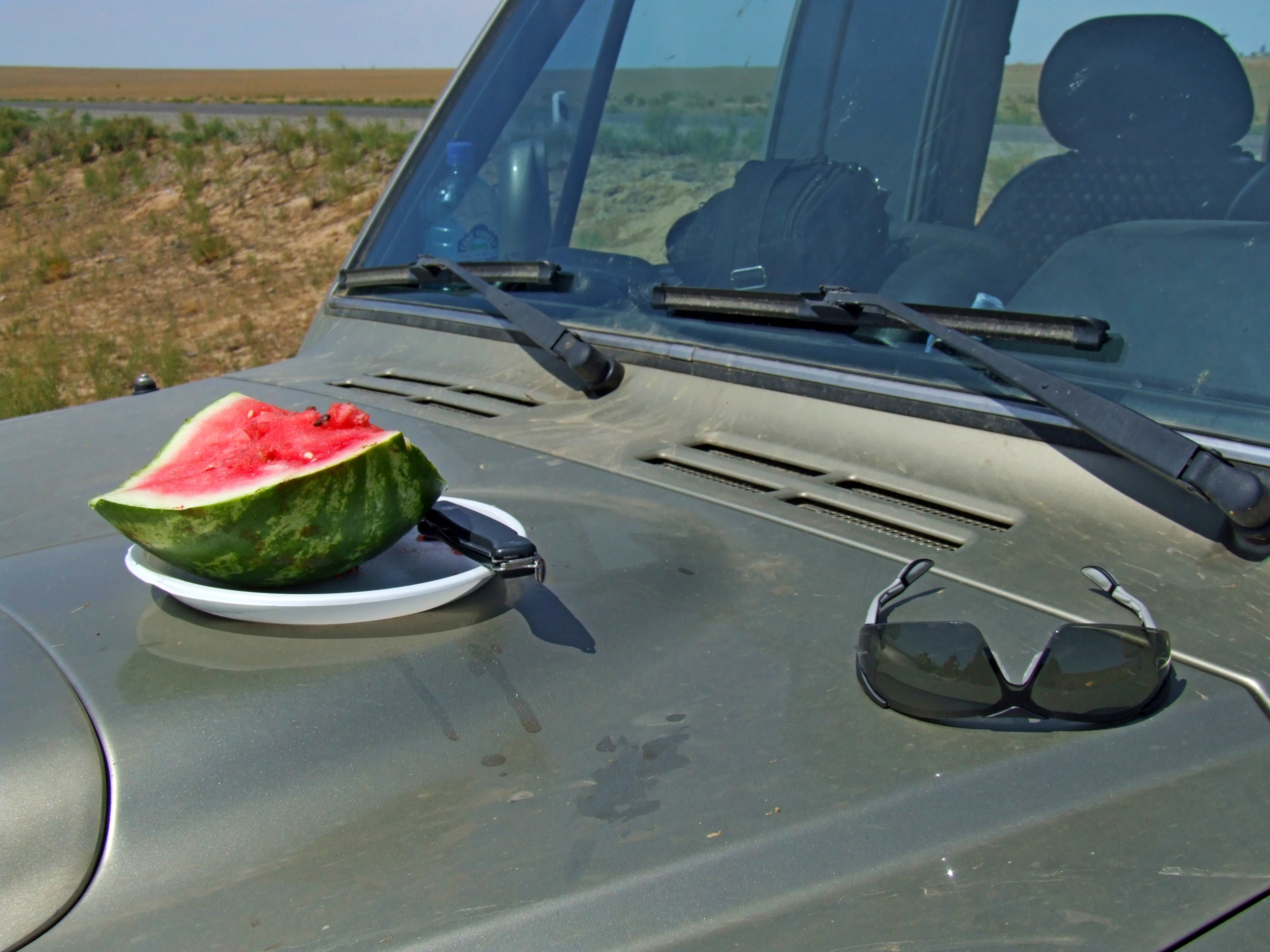 Под Чимкентом гаец поинтересовался даже ПТСом на мою машину. Дело было под утро, спорить особо не хотелось, да и ПТС с собой я предусмотрительно взял, ибо читал о попытках развода на базе отсутствия оного… Настоятельно предлагали то сопровождение, то помощь в прохождении границы, то машину требовали помыть (после пустыни мы были НЕМНОГО пыльными). В общем, ничего им не обломилось. Времени в обрез, ломимся дальше.