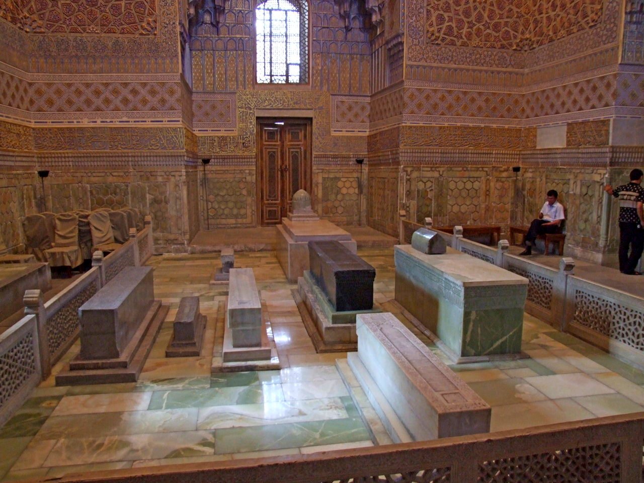 С именем Тамерлана и его могилой уже связана одна легенда. Есть два исторических совпадения – а совпадения ли?.. Когда его могилу вскрыли и перевезли в Москву – началась Вторая Мировая Война и пошли самые тяжелые деньки для СССР. Когда могилу вернули обратно – была выиграна Сталинградская битва, ставшая переломным моментом в ходе боевых действий. Вот эта могила, черный камень по центру. В окружении учеников и наставников.