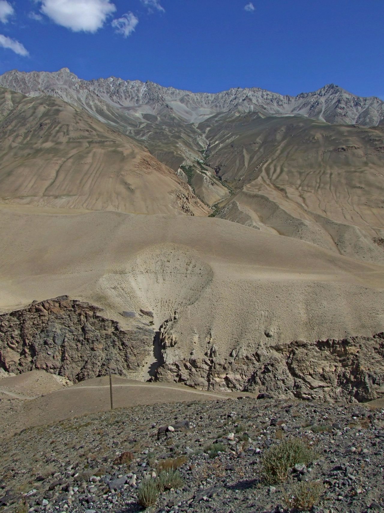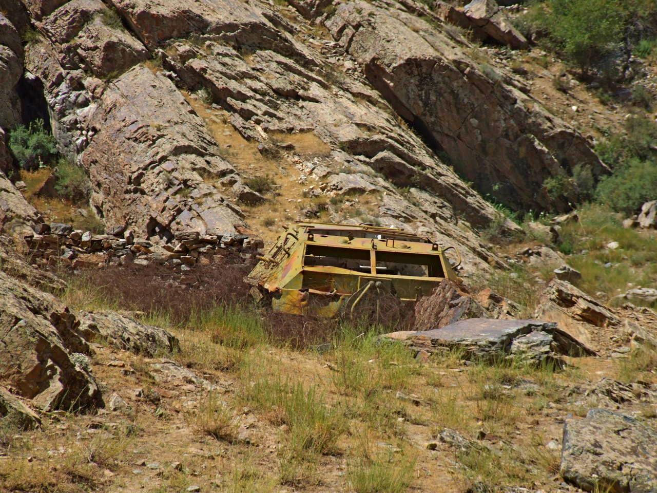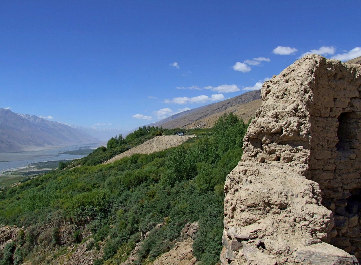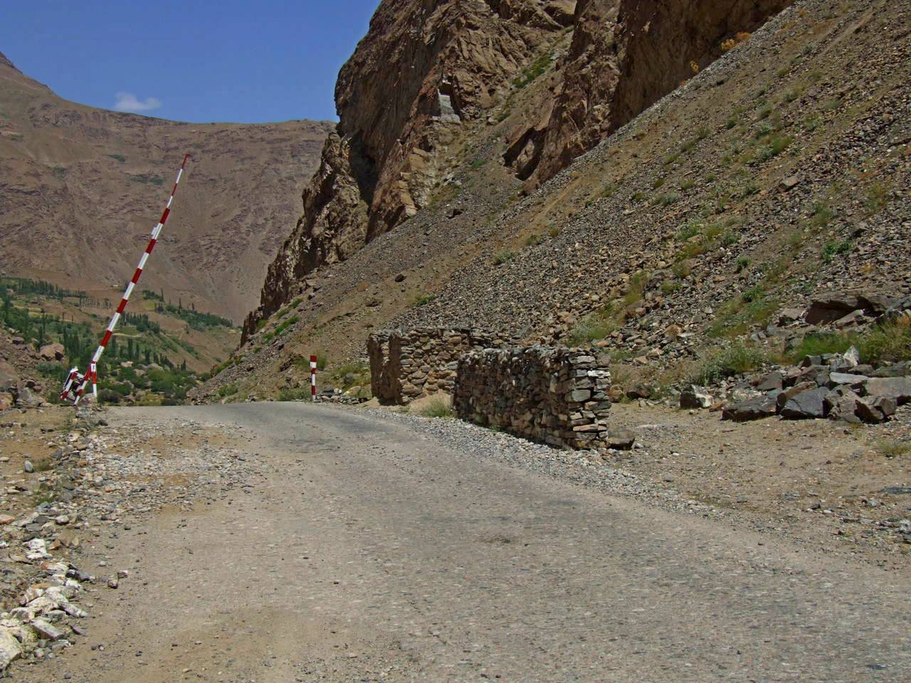 Пост таджикских пограничников. Действующий. Очень грамотную позицию занимает: доминирующая высота и организация поста позволяет моментально расстрелять тех, кто едет по дороге.