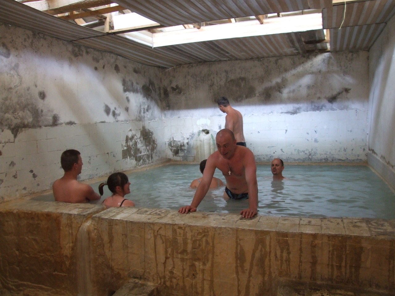 Вечером поехали на другой горячий источник – Биби-Фатима (по указателю на крепость Ямчун, налево). Подъем был крут, долог и тяжел. Останавливался остужаться дважды, пониженная не спасала. Искупались, погрелись – те же 10 сомони с человека. Отдельных ванночек уже нет, только общая. Тоже, час мужской, час женский. Совместные ванны располагают к задушевному общению с местным населением. Они очень гордятся своими источниками!