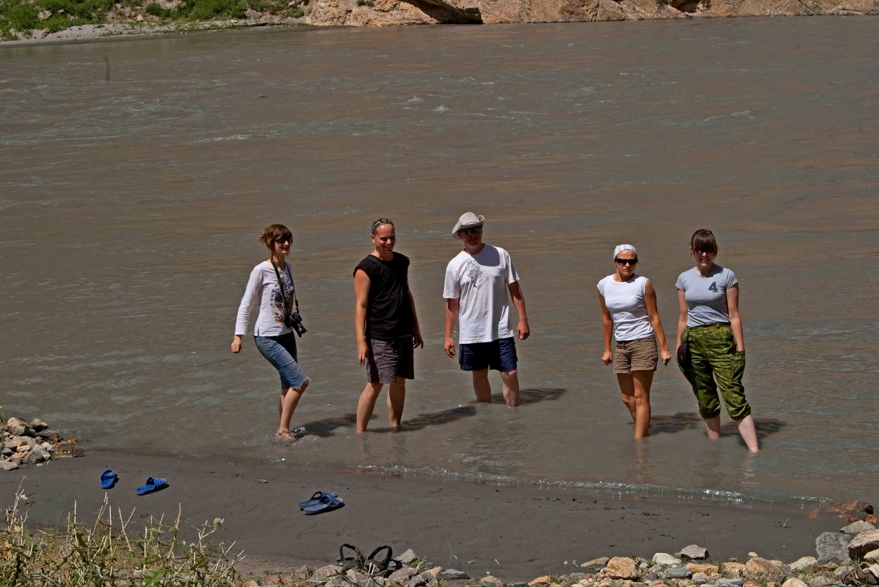 Омываем ножки в Пяндже. Вода настолько ледяная, а течение настолько бурное, что мыслей сплавать в Афганистан просто не возникает – ноги начинает сводить уже через полминуты стояния по колено… Дно, кстати, песчаное, но очень топкое – стоишь и чувствуешь, как медленно и печально тебя засасывает…