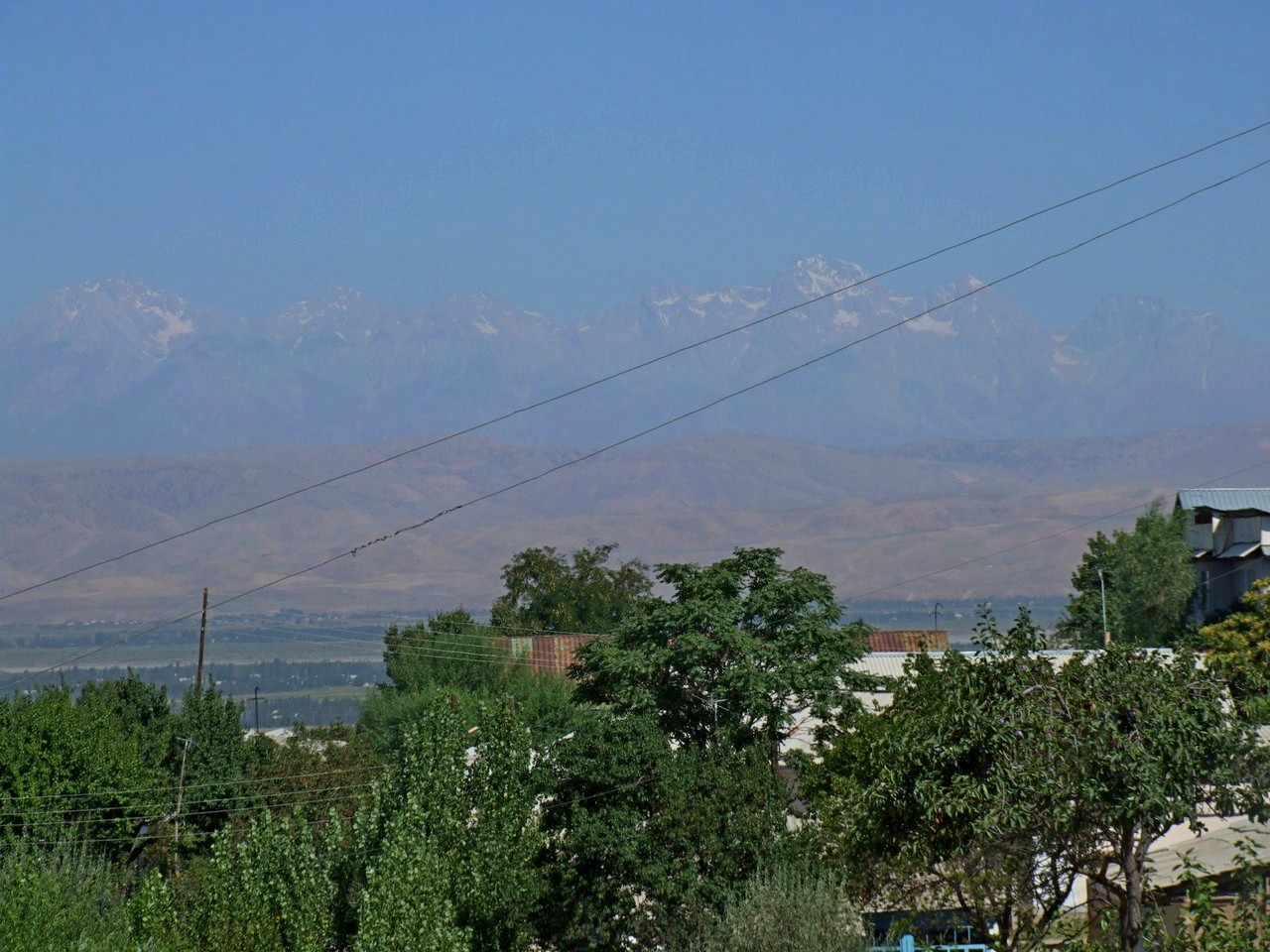 Наша дорога на Бишкек весьма живописна и пролегает через горный хребет Тянь-Шань. Асфальт, довольно пологие подъемы и спуски, повороты и изгибы. Очень красиво! Моя машинка справлялась даже с кондиционером – по-крайней мере две трети пути.