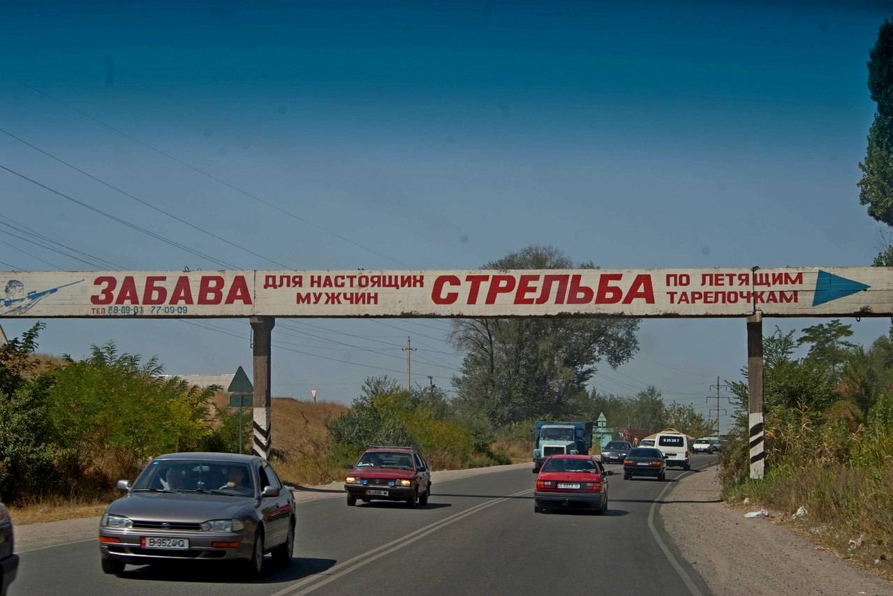 По дороге в аэропорт видели рекламу стрелкового стенда. Видимо, настоящие мужчины в Киргизии настолько суровы, что бьют тарелочки влет пулями из мелкашек с оптикой.