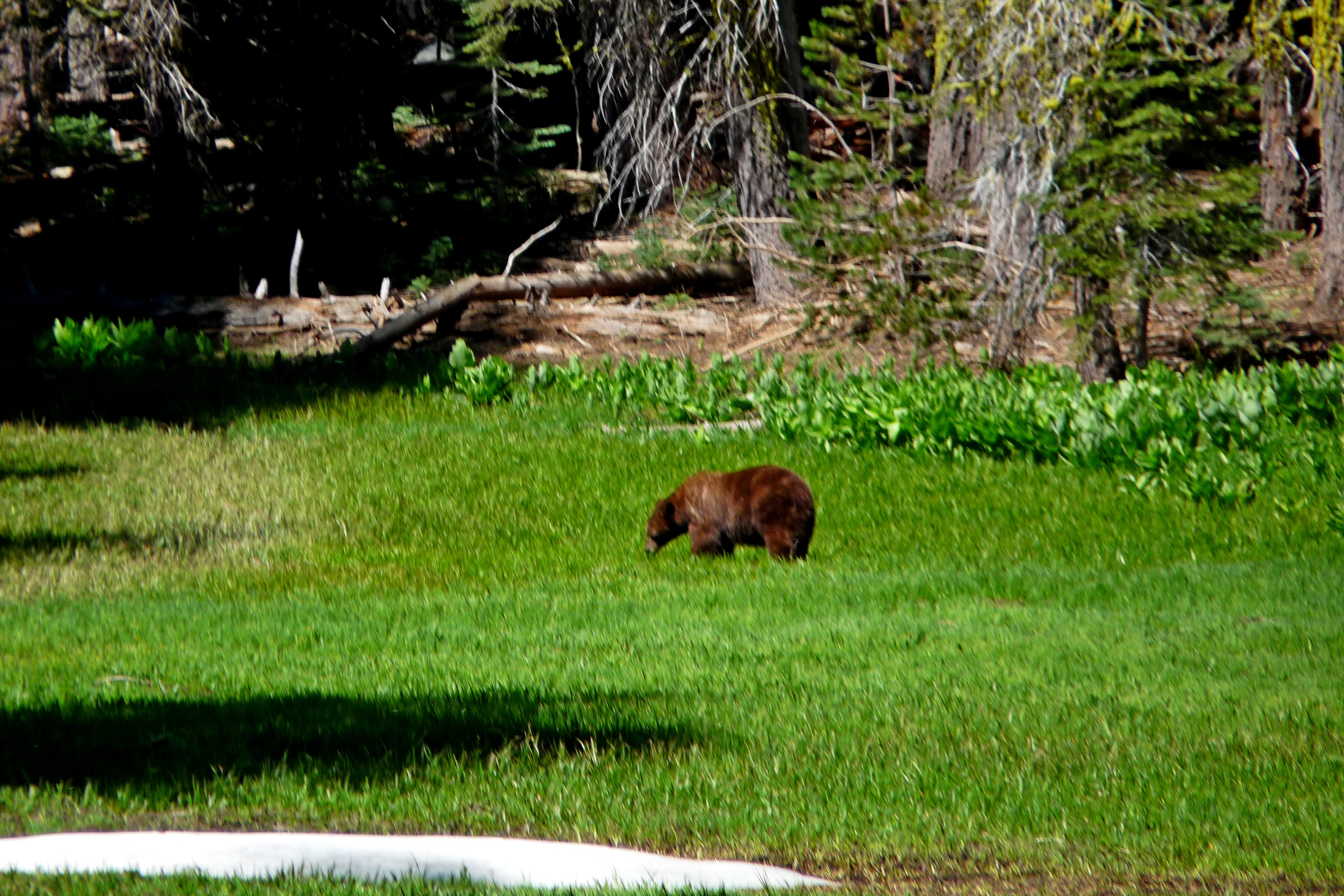 А вот и мишка — пасется. Людей они совершенно не боятся, можно сказать, не замечают. Однако, увидев мишку на обочине, даже законопослушный американский народ останавливается и создает пробку — начинает его фотографировать. В несколько минут нарисовывается рейнджер. Нет, он не будет расталкивать пробку и разгонять публику. Он просто проконтролирует, что между людьми и животными — безопасное расстояние.