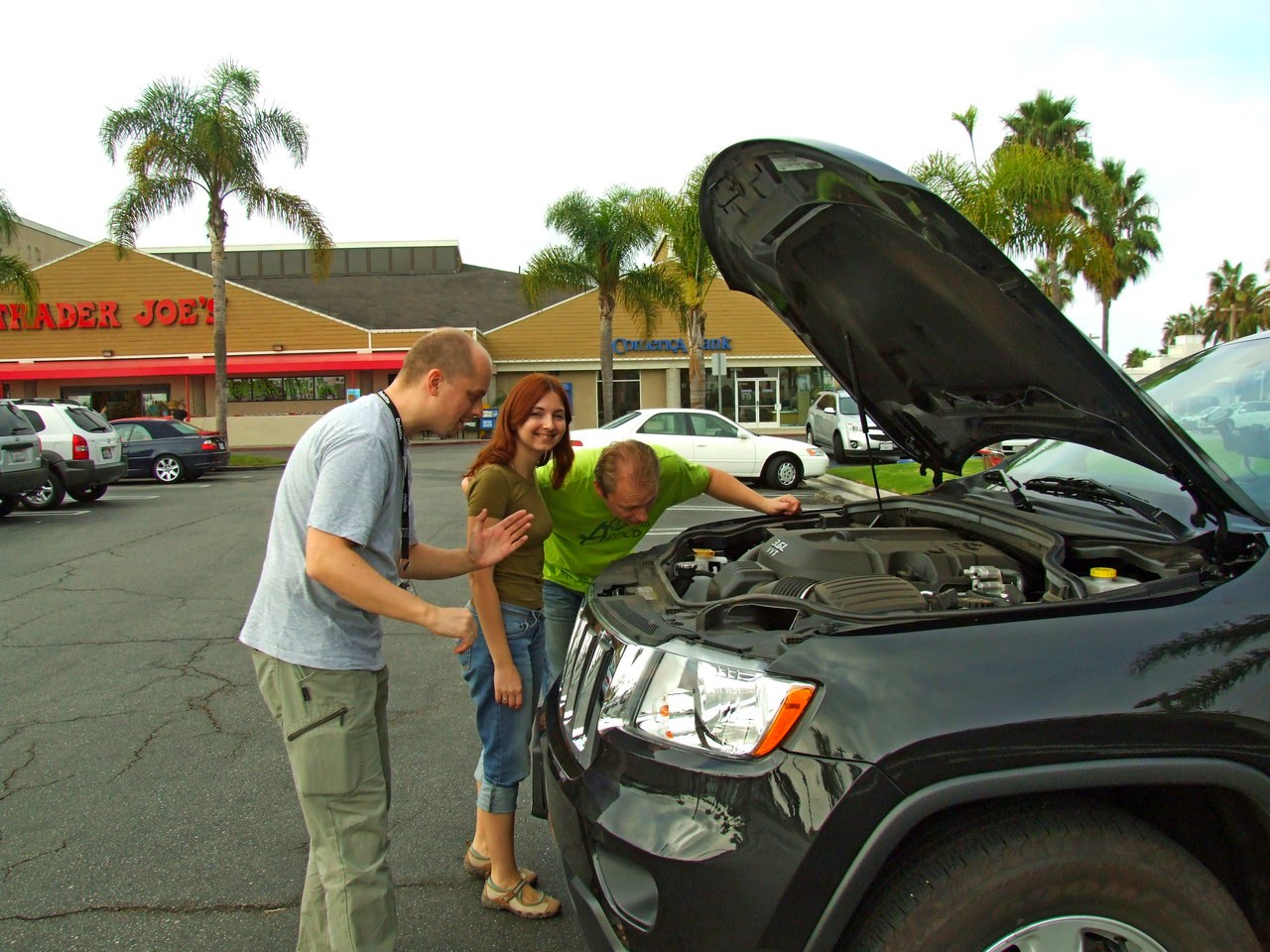 Нас очень интересовало, что у нашего крокодила под капотом и мы тут же полезли смотреть. Оказалось 6-ицилиндровый бензиновый 3.6… причем между радиатором и шкивами ГРМ было сантиметров 15-20 свободного пространства — очень непривычное зрелище для всех тех, кто привык к компактной компоновке подкапотного пространства современных европейских автомобилей. Я так понимаю, это запас под еще более объемные двигатели.